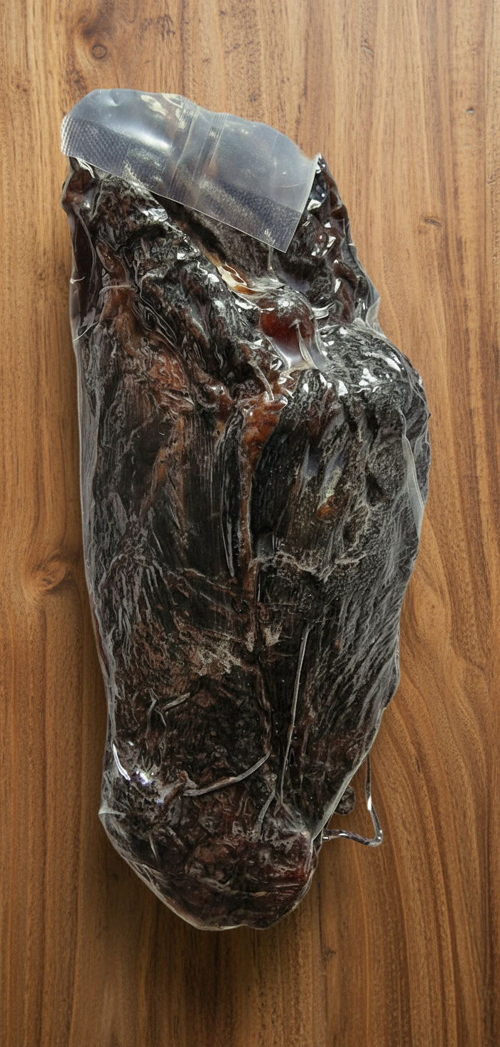 Feinheit durch Langzeit-Veredelung: Die Herstellung unseres Ziegen-Knochenschinkens ist ein Bekenntnis zu Geduld und Handwerkskunst. Der Schinken wird traditionell am Knochen belassen, was entscheidend für die intensive Geschmacksentwicklung und die Erhaltung der natürlichen Saftigkeit ist.